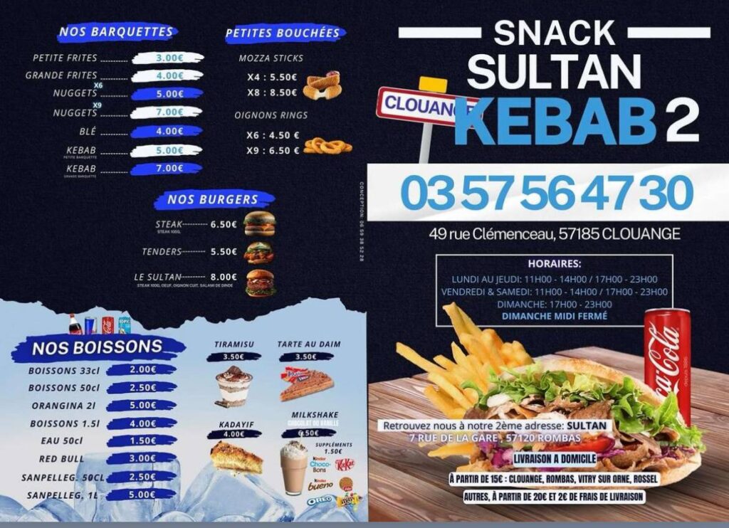 Pour plus d’informations ou pour passer commande, contactez le 03 57 56 47 30 ou consultez leur page sur http://sultan-kebab-2clouange.eatbu.com/. Une adresse à retenir pour une pause savoureuse !